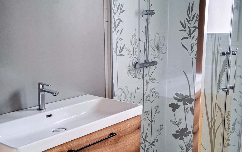 Le résultat : un mur de douche entièrement habillé d’un visuel personnalisé, sans joint apparent, avec un rendu lisse et homogène. Le client a retrouvé une salle de bain transformée, avec un revêtement mural résistant et facile à nettoyer au quotidien.