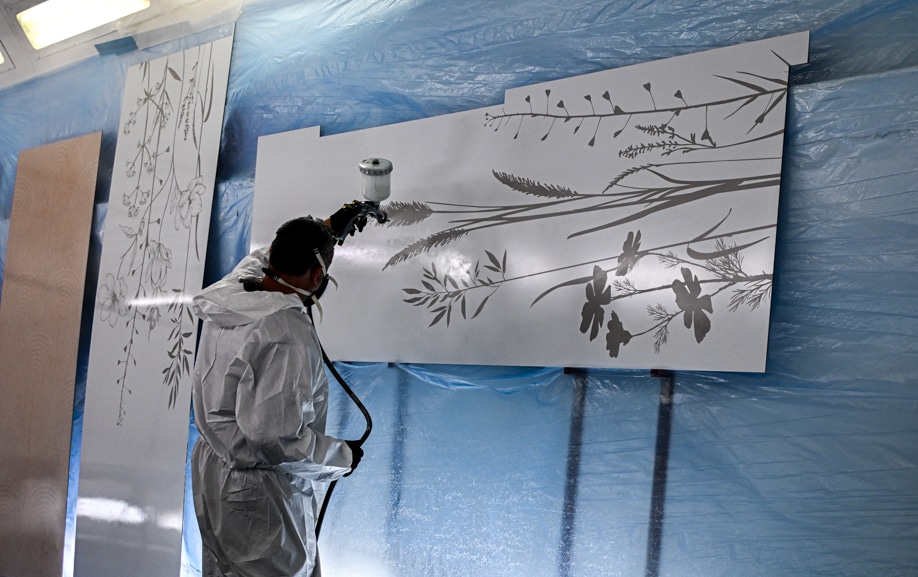 Après impression, le panneau a reçu une couche de protection supplémentaire pour garantir la tenue des couleurs dans le temps, même dans un environnement humide. La découpe a été effectuée aux dimensions exactes, avec les ajustements nécessaires pour les passages des raccords muraux.